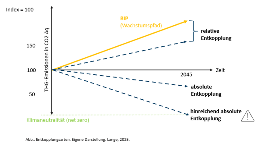 Absolut entkoppelt sind BIP und THG-Emissionen dann, wenn der THG-Ausstoß nicht nur relativ, sondern auch absolut abnimmt, während das BIP wächst. Nach wie vor werden THG emittiert und die Menge an THG in der Atmosphäre erhöht sich. Es kommen jedoch jedes Jahr weniger neue THG dazu, während das BIP (d. h. die Menge der erwirtschafteten Waren und Dienstleistungen in einem Jahr) weiter steigt.